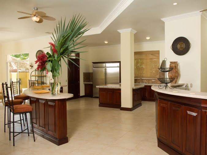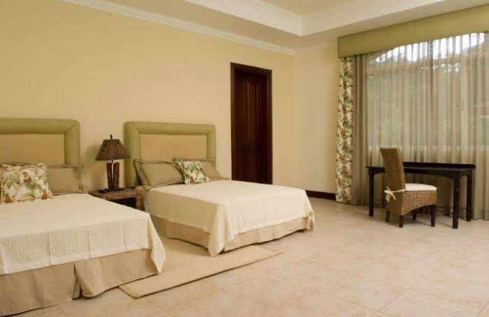 Four of the seven bedrooms in this opulent beach rental property are master suites and have a plush, king size beds. The next two bedrooms each contain 2 full size beds. In this villa there is also a luxury guest home apart from the villa and houses one king size. This vacation rental also a maid’s quarter which has one full bed and one bunk bed, as there is daily maid service- a staple amenity in the Los Suenos vacation resort in Jaco Costa Rica.