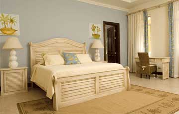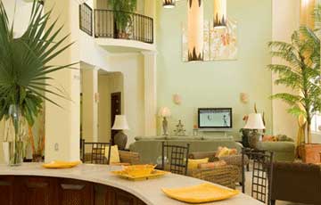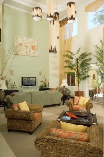 Each bedroom is equipped with a 37†plasma TV and is decorated with a tropical/nautical theme. The tropical design and tranquil ambience transcends to the rest of the vacation villa. This 8000 square foot home has a huge great room with 22-ft ceilings, 60†plasma TV, comfortable seating for a large group, and fabulous home theater system. The fully stocked gourmet kitchen and generous dining area and extend from the great room and amply seats 14 guests.